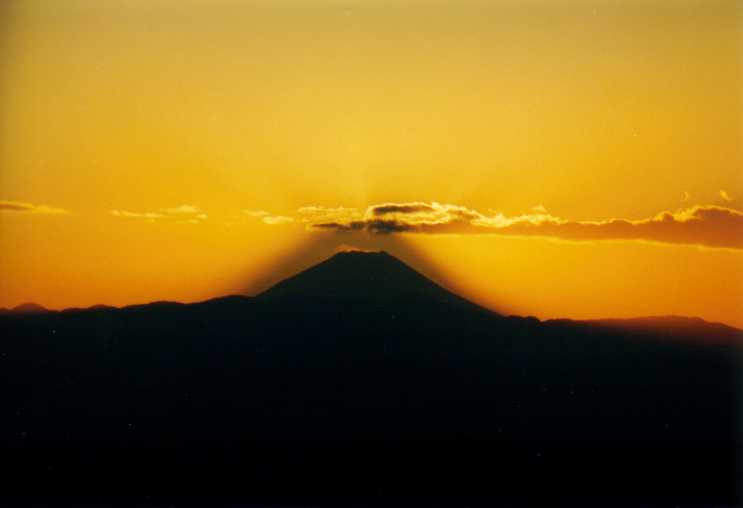 富士山に日が沈む風景を、恵比寿ガーデンプレイスタワーから撮影しました。